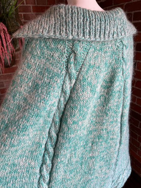 An original 1960s turquoise cable knit collared cape. Front button closure. Perfect for the winter time.