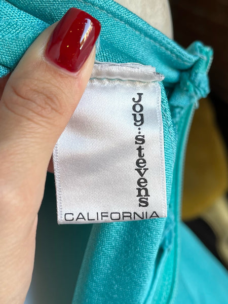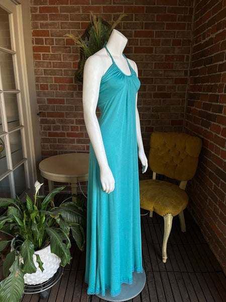 Cute and vibrant turquoise 1970s nylon maxi dress by Joy Stevens! Halter top bodice with adjustable straps, back nylon zipper. It seems as the previous owner had stitched some matching lace at the hem which gives it a nightgown look.